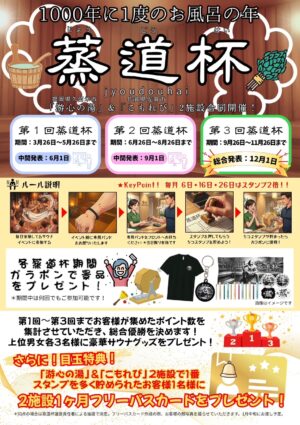 2026年03月10日 休館日のご案内 2026年03月05日 炭酸泉復旧のご案内 2026年02月19日 3月イベントのご案内♪ 2026年01月28日 2月イベントのご案内♪ 2026年01月20日 2026年 冬の感謝祭のご案内⛄