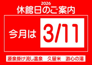休館日のご案内 2026年03月10日 いつも游心の湯をご利用いただきありがとうございます。 2026年3月11日(水)は休館日となります。 お客様におかれましては、ご迷惑をおかけいたしますが、 何卒ご理解とご協力の程よろしくお願い申しあげます。