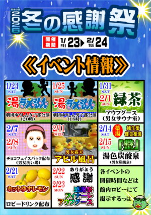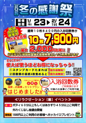 2026年 冬の感謝祭のご案内⛄ 2026年01月20日 2026年 1月23日(金)~2月24日(火)まで 冬の感謝祭を開催いたします!! 皆様のご来店心よりお待ちしております(^^)/ 期間中はイベント盛りだくさん!回数券もお得に購入できます!